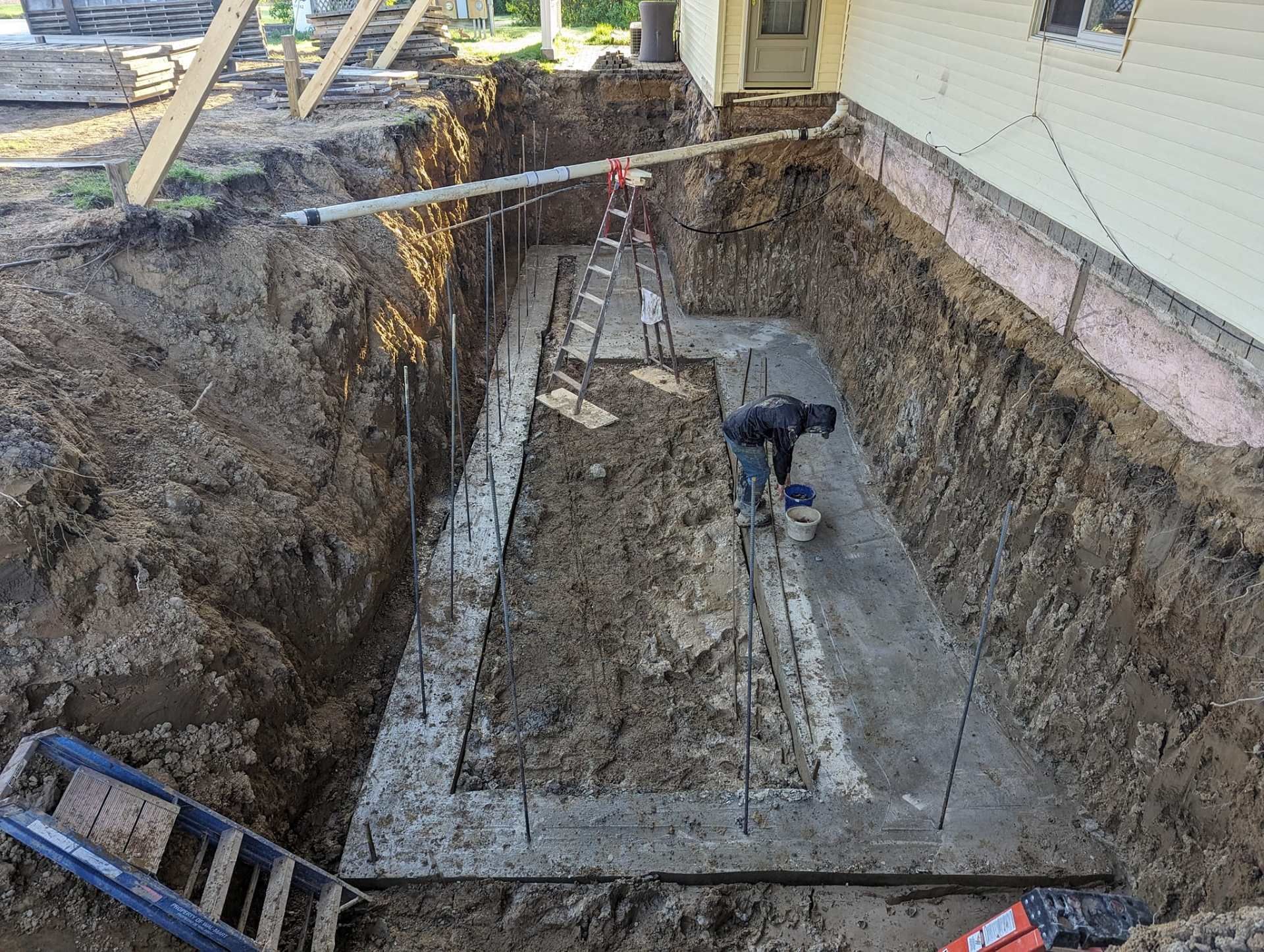 The footing must extend below the frost line to prevent heaving, which in many regions means a depth of at least 36 inches, though this varies depending on local conditions and soil composition.